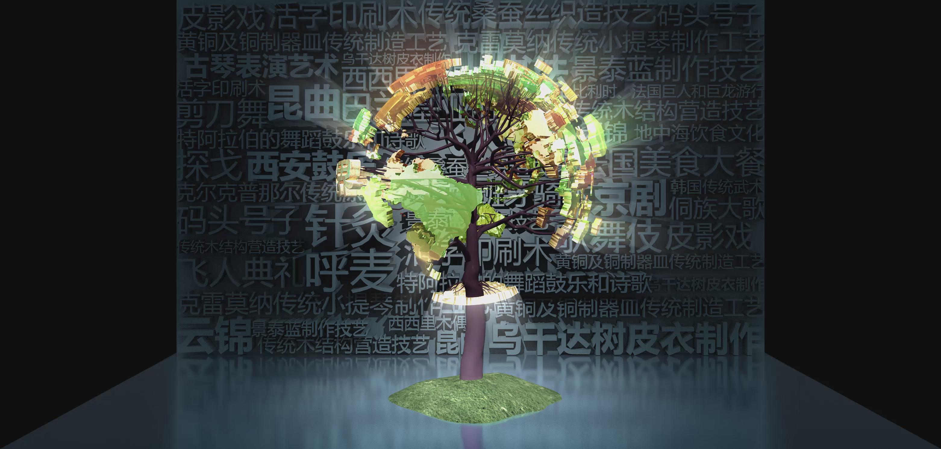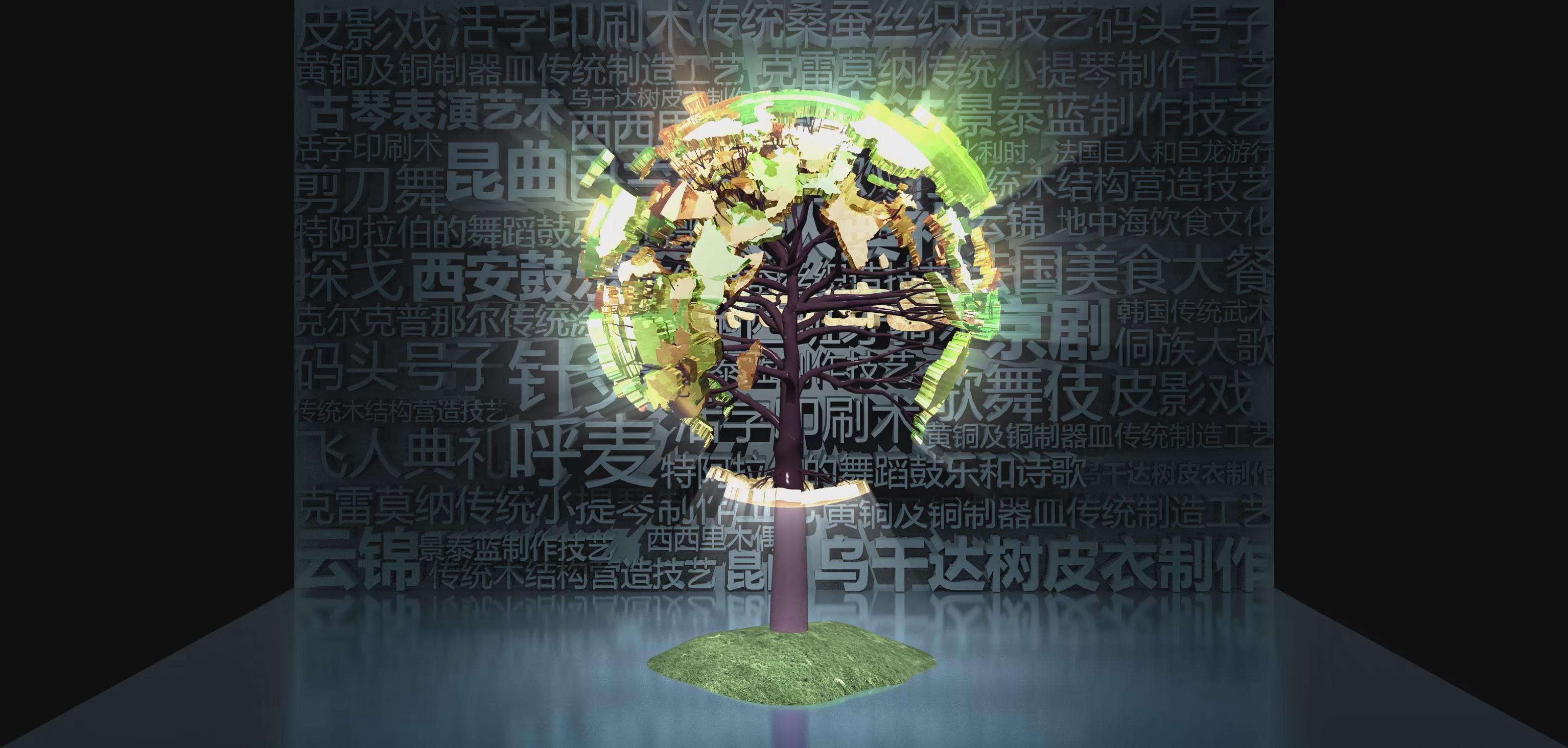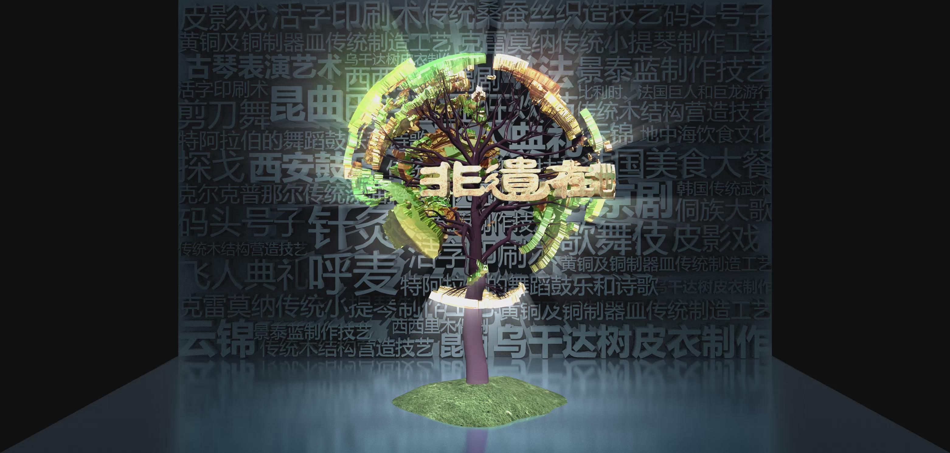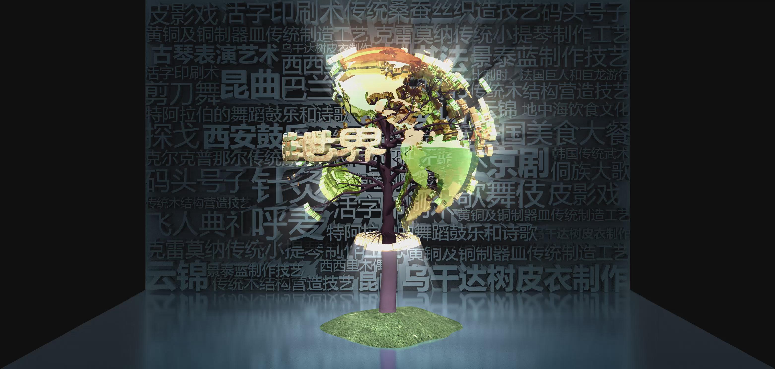 截止2017年6月,中國已有39個項目躋身世界級非物質文化遺產,項目總數位居世界第一。其中,人類非物質文化遺產代表作名錄31項,急需保護的非物質文化遺產名錄7項,非物質文化遺產優秀實踐名冊1項。 以折幕形式向大眾展示世界非物質文化遺產,在背景圖中列出了多種非遺事項,結合立體模板大樹的形式,讓大家可以了解中國的非遺項目。