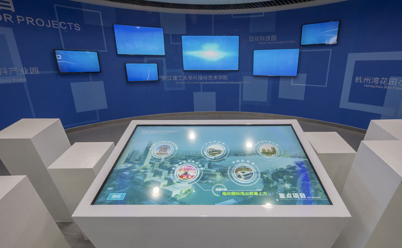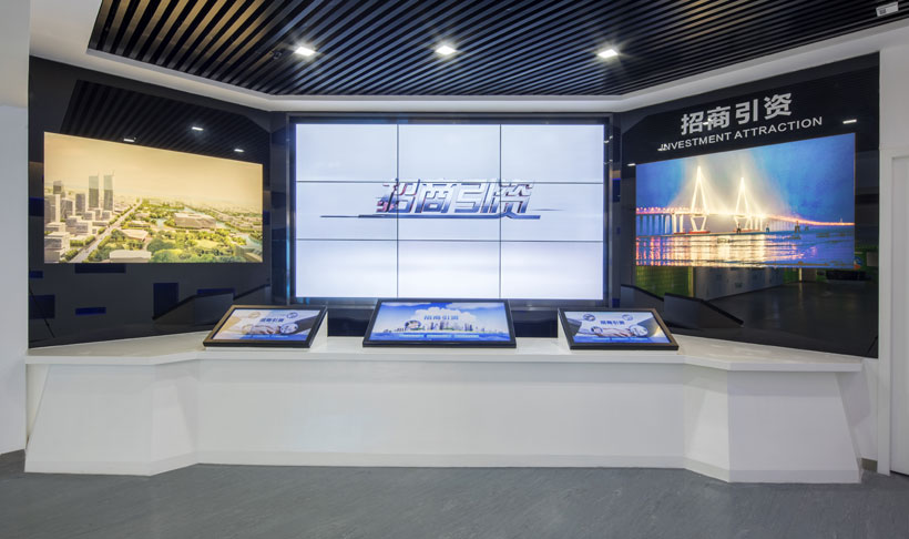 主形象墻:展廳名稱、序言。LED屏:杭州灣上虞經濟開發區總體形象宣傳。9屏拼接:各級領導視察園區照片和相關媒體報道,32寸觸控一體機、墻面沙盤模型、圖文觀看圖版及模型。可在觸摸屏中查詢杭州灣上虞經濟技術開發區的詳細概況內容,沙盤演示杭州灣上虞經濟開發區在長三角所處的位置,及海陸空各交通線路。新舊對比:觀眾揮動手臂,擦除老照片,顯示開發區新照片,產業布局:65寸透明屏*1、圖文版,展示先進裝備、汽車及關鍵零部件、綠色電子電器、新能源新材料、生物醫藥、現代服務業等產業基地在開發區的布局和規劃。招商引資:32寸觸控一體機*2、46寸觸控一體機*1、拼接屏*9展示政策優勢、完善配套、服務體系、科技創新。